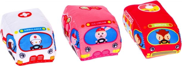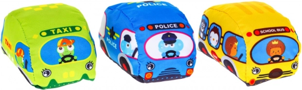 Three cars crinkle, three jingle, and three squeak – varied sound stimuli support auditory perception and curious play.