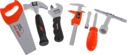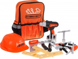 The backpack is made of durable fabric, featuring a zippered main compartment, side and front pockets, and adjustable straps for comfortable carrying. The set includes a saw, hammer, screwdriver with bits, wrenches, screws with nuts, and mounting plates—all in a kid-friendly, lightweight, and durable design.