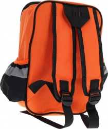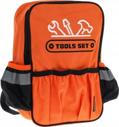 A lightweight textile backpack with a zippered main compartment, external pockets, and reflective elements keeps tools organized and safely in one place.