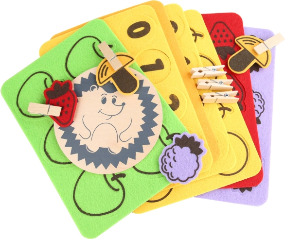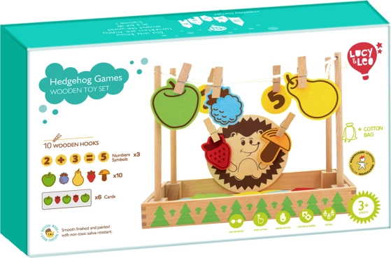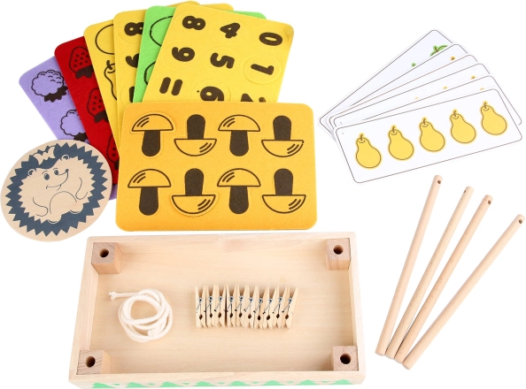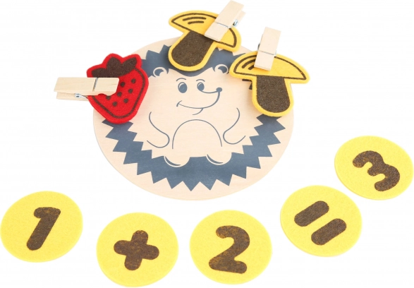The set includes a wooden base, a hedgehog, fun cards, and colorful felt mats - perfect for shared play among multiple children. For easy storage, everything is packed in a practical cotton pouch.