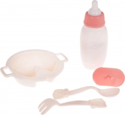 The set includes a pacifier, powder in a jar, a bottle with teat, a spoon, a fork, and a divided bowl — everything kids need for complete doll care.