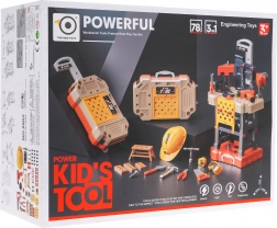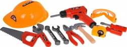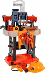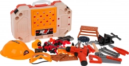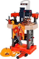 The set includes a wide range of plastic tools (saw, hammer, pliers, screwdrivers, wrenches), a vise, gears, fasteners, and protective gear (goggles, helmet). Kids can safely practice fine motor skills, hand–eye coordination, and logical thinking while enjoying fun pretend workshop tasks.