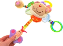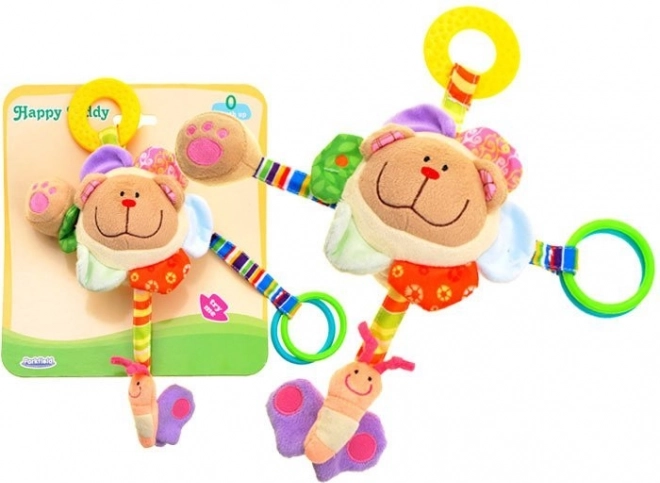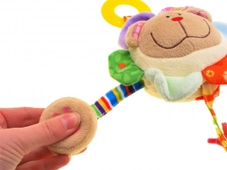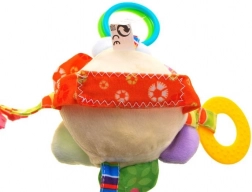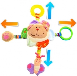 Inside the head is a rattling ball that produces a gentle sound when shaken, ideal for attracting attention and encouraging movement. The curtain includes four colorful ribbons with various playing elements: