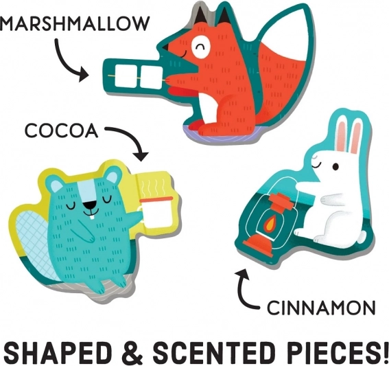 Dive into a world of forest friends around the campfire. This scented puzzle brings not only the joy of assembling but also a playful sensory element — three special pieces smell like marshmallow, cocoa, and cinnamon. Thanks to rich colors, a matte finish, and a smooth back, the pieces feel great in hand and fit together beautifully.