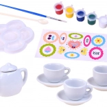 3 cups, 3 saucers, a teapot with lid, paints, a mixing palette, a brush, a small spoon for applying paint, colorful stickers