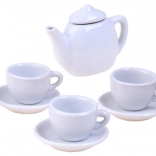 The smooth white surface is great for painting. Dimensions: cup height 3 cm, saucer diameter 6 cm, teapot with lid height 6 cm.