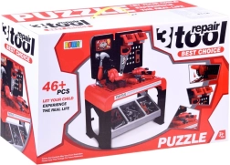 The set includes a workbench with shelves and a work surface. It also comes with a hand saw, a screwdriver with interchangeable bits, a hammer, and pliers. You’ll also find various screws, nuts, and wooden plates with holes. Everything is stored in a clear box that makes organizing the parts easy.