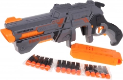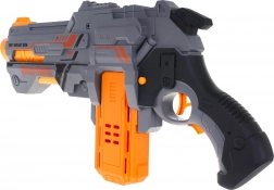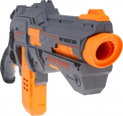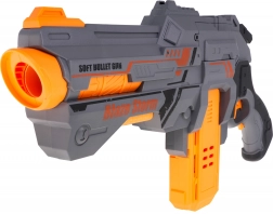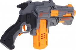 The semi-automatic BLAZE STORM pistol in an elegant gray color delivers action-packed fun for kids aged 8 and up. It offers easy handling, a bottom magazine, and fires soft foam darts with rubber tips for safer play. The blaster is powered by 4× AA batteries (not included) and is ideal for indoor and outdoor battles. Easy operation, comfortable grip, safe foam darts, and a reliable magazine for maximum fun.