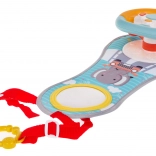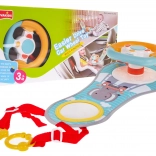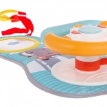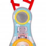 The dimensions of the set are approximately 43 cm x 21 cm x 10 cm and it easily attaches to the headrest of a seat. The toy is suitable only for children sitting in the direction of travel and is not designed for infants facing against the direction of travel. Stimulation of the child's senses occurs through sounds and lights.