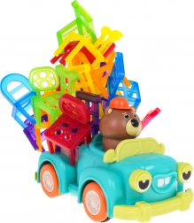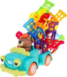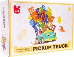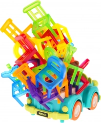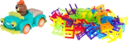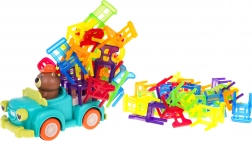 The skill game Folding Chairs and Car is ideal for children aged 3 and up. It consists of 48 colorful chairs of various shapes and a car that moves in a circle. Your task is to build a tower of chairs on the moving car. This task improves hand-eye coordination and increases precision. The car can adjust the rotation diameter between 40 cm and 120 cm using a wheel on the bottom of the vehicle.