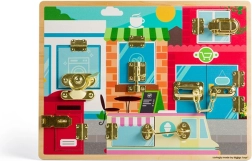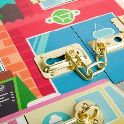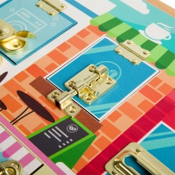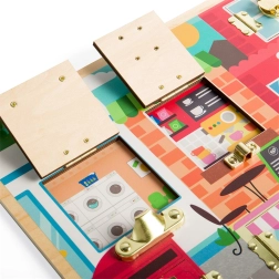 This high-quality wooden activity board in the Montessori style gives children a safe space to practice grasping, patience, and problem-solving. Behind each door with a different type of closure is a colorful scene (laundry room, kitchen, café, and more) that encourages discovery and strengthens imagination.