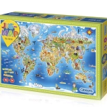 Richly illustrated world map with images of animals, landmarks, and points of interest, serving as a great tool for developing geographic knowledge. It contains unique pieces with the names of countries and continents.