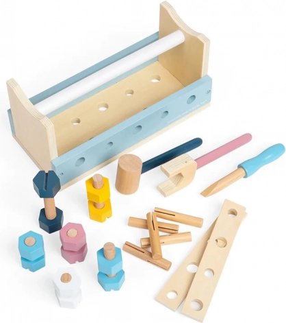 The Wooden 2-in-1 Tool Box BIGJIGS TOYS is a cleverly designed building set and workbench in one. Kids can tighten screws, hammer nails, and practice hand–eye coordination. After play, all parts store neatly back in the box.