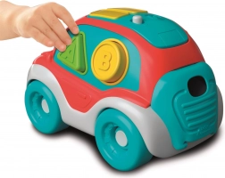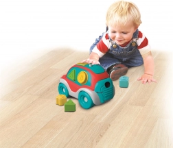 The car offers slots for various geometric shapes. As children insert the pieces, they practice fine motor skills and learn to recognize both colors and shapes.