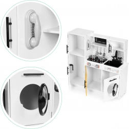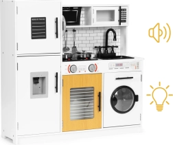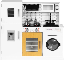This stylish kids’ kitchen in a white-and-wood design closely imitates a real kitchen. Thanks to the glowing hobs and cooking sounds activated by the red buttons, play is even more engaging. Opening doors on the fridge, oven, microwave and washing machine, turning stove knobs, and a “water dispenser” with bubbling sound support realistic play scenarios.
