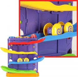 The run features two independent circuits — a marble track and a car track — so one or more children can play at the same time. The robust plastic build is easy to clean and ready for everyday use.