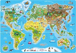Explore the world from the comfort of home with playful puzzles for kids and adults. Geography puzzle with a world map offers an overview of continents, world landmarks, and animals by region. Excellent for both fun and learning, with illustrations by a Czech artist.