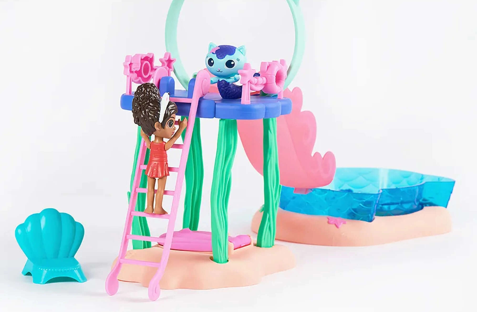 Gabby figure with removable mermaid tail, MerCat figure, slide, pool, ladder, shell with image, octopus sprayer, floaties, Cat Delivery with minifigure and QR code