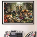 A richly illustrated scene with a lion, elephant, tiger, and exotic birds stands out with saturated colors and crisp printing—perfect for display once completed.