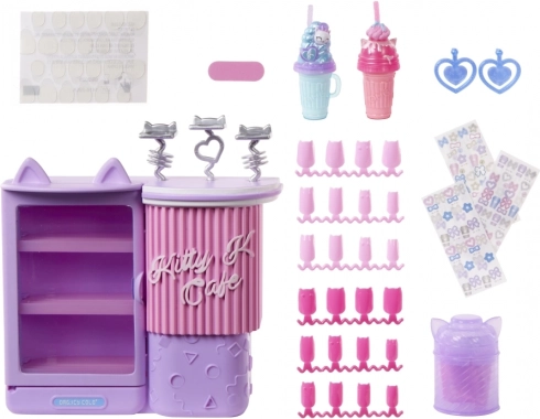Doll, café counter with mini “fridge,” cups, taps/molds, manicure tools, stickers, glitter, mini polish, and other accessories