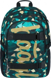 Backpack with three separately closable compartments, including a laptop pocket and straps for a skateboard. Lightweight and water-resistant material.