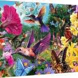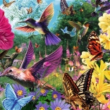 A vibrant garden scene with hummingbirds and butterflies brings joy with every piece and a great visual experience.