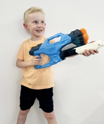 Durable plastic construction, an ergonomic handle, and a smooth-trigger action ensure comfortable and safe use. The futuristic blue-and-black design appeals to both young and old adventurers and encourages active outdoor play.