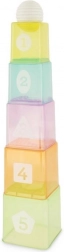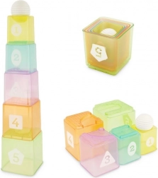 The Infantino stacking cups with ball set is ideal for first explorations of shapes, colors, and numbers. The transparent cups with clear numbers can be stacked from smallest to largest to build stable towers, which develops fine motor skills and spatial awareness.