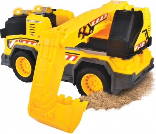 Friction-free truck with light and sound functions. Excavator on the platform with a rotating arm (360°). Maximum arm height 34 cm. Try Me function, batteries included. Length 30 cm, age 3+.