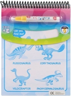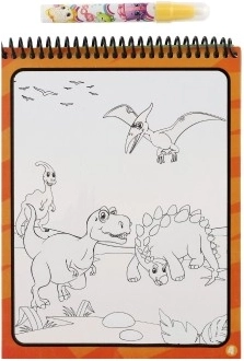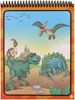 Discover the magic of water painting with this unique coloring pad that offers four reusable pages with dinosaur themes. Children use a water pen that reveals hidden colors in the pictures, which turn transparent again for new painting once they dry.