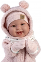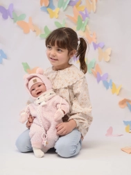 Discover the gentle Llorens New Born baby with a soft fabric body that feels natural and pleasant to hold. With a light press of the chest, the baby responds with cheerful laughter and the words “mama”, “papa”. Thanks to joint-mounted arms and legs, the doll is poseable and can sit on its own.