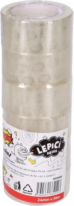 Set of transparent adhesive tapes with a width of 24 mm and a length of 30 m, ideal for everyday use in the office or at home. Each package contains 6 pieces of tape.