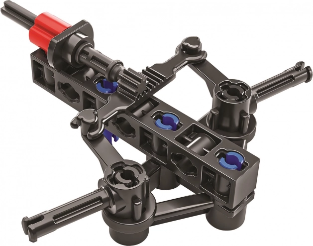 Technic-style parts with axles, gears, and connectors demonstrate motion transfer and mechanical principles in practice.