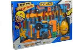 The set includes powered elements (drill, grinder, and circular saw) using 2× AA 1.5 V batteries, as well as hand tools and fasteners for building and screwing. The practical work belt keeps tools always at hand and supports independence and work organization.