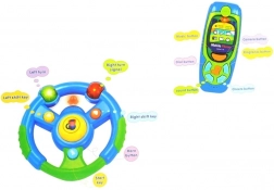 Our interactive set for kids includes a steering wheel, phone, and keys. Each part is crafted to easily fit into small children's hands, providing fun and educational play.