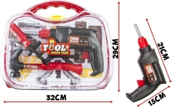 Included are a realistic toy drill, a functional screwdriver with interchangeable bits, a small hammer, screws, and three plates for practicing assembly. Everything is made of lightweight, durable plastic safe for children’s play.