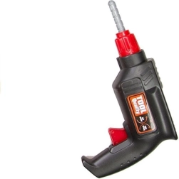 The toy drill with a rotating bit sparks imagination and teaches safe handling of tools.