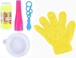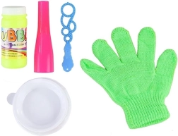 - Glove (universal size), solution bowl/base, bubble wand, pink funnel/tube, bottle of bubble solution