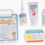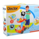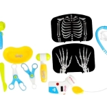The set includes a wide range of accessories: stethoscope, scissors, scalpel, reflex hammer, pulse oximeter, glasses, medical board, X-ray images of the head, chest, and hands, boxes of “medicine,” and other small items. The set is ideal for developing fine motor skills, social play, and creative imagination.