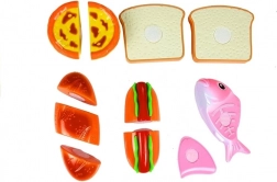 Discover the fun world of cooking with a kids’ food set where each piece is held together by hook-and-loop fasteners. Children can prepare a hot dog, serve fish, slice bread and pastries, or “bake” a cupcake. The safe plastic knife and cutting board allow realistic yet completely safe cutting.