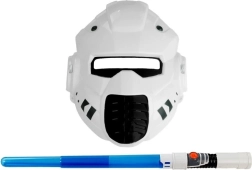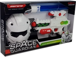 The space combat set consists of a gun and a telescopic sword. The color scheme of these defense items features bright muted tones combined with intense red and coral shades. The mask included with the set is designed in a white-gray palette, has a rectangular eye opening, mouth openings, and an elastic strap attached at the back to ensure the mask stays in place during play.