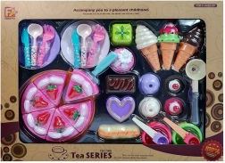 Includes a realistic-looking pink cake with strawberries and cream that children can cut and serve.