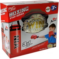 Victory in training or in a fun match is sweetened by the championship belt with golden elements and colorful gems. Also included are perfectly fitting boxing gloves.