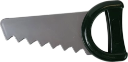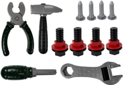 Saw, hammer, pliers, screwdriver, wrench, screws, nuts, and screw‑together plates—all made of durable plastic with no sharp edges.