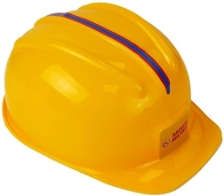 A lightweight plastic helmet adds authenticity to play and teaches basic safety in a construction or workshop setting.