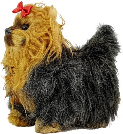 A cute interactive Yorkie dog is an ideal companion for children from 3 years. When touched or petted it barks, moves its head and tail, and when pressed on the side it walks forward accompanied by a cheerful melody. The realistic design with brown‑black fur and a red bow supports the development of empathy and responsibility through play.