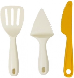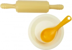 The set includes a rolling pin, spoon, spatula, serving knife, and a bowl—everything for realistic play in a kids’ kitchen.
