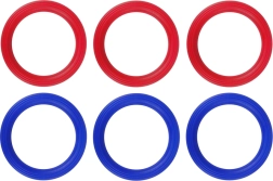 Six durable plastic rings in two colors (red and blue) let multiple kids and adults play at the same time.