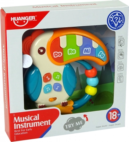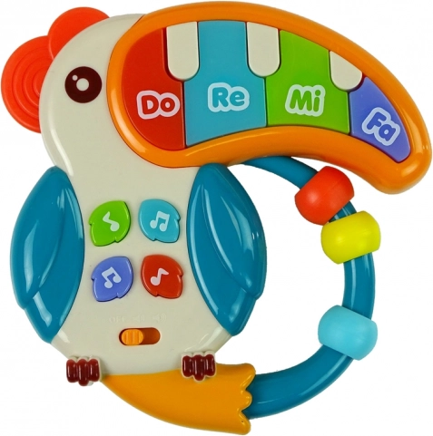 The musical piano in the shape of a parrot is ideal for developing children's senses. Thanks to the 5 colorful keys DO RE MI FA with light effects, children can enjoy different melodies and sound effects, which strengthens their ability to distinguish sounds. Small note-shaped buttons activate additional features such as various sounds and melodies.