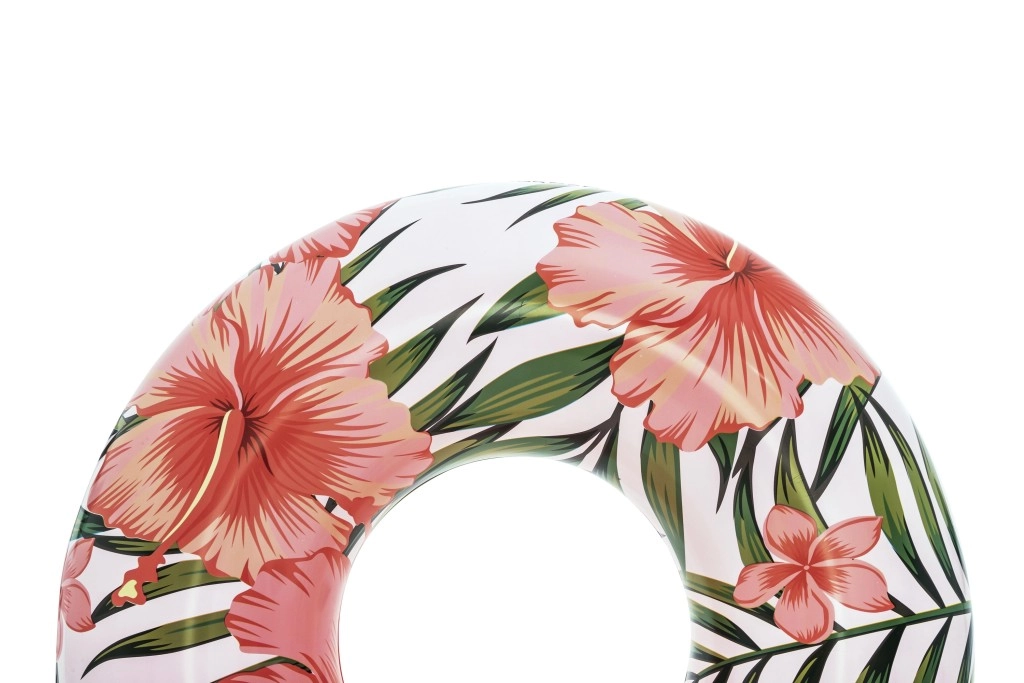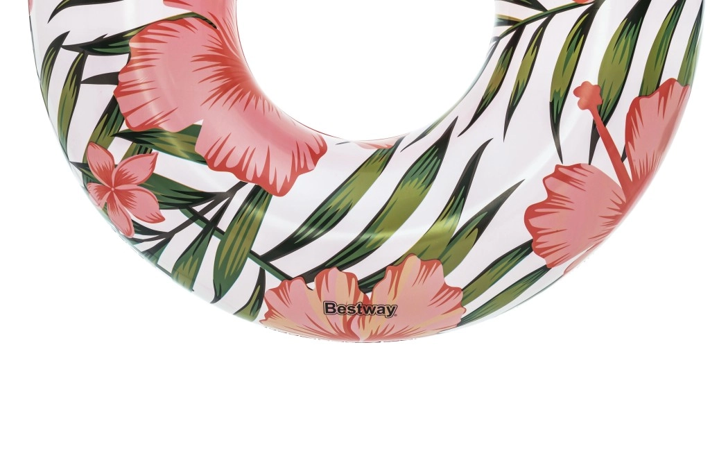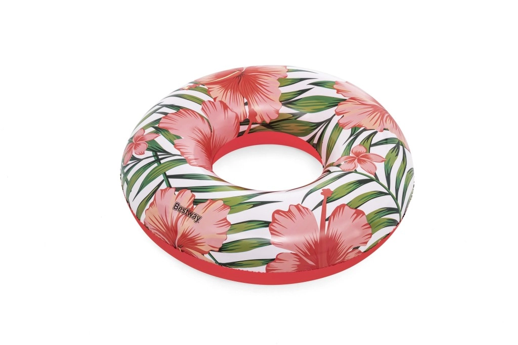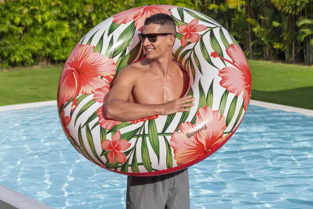 Enjoy summer with the BESTWAY swim ring, 119 cm in diameter, featuring a modern tropical design. Made from durable PVC, suitable for kids 12+ and adults. Easy to inflate and deflate, features a safety valve, and is ideal for relaxing or playing in the water at the pool, beach, or lake.